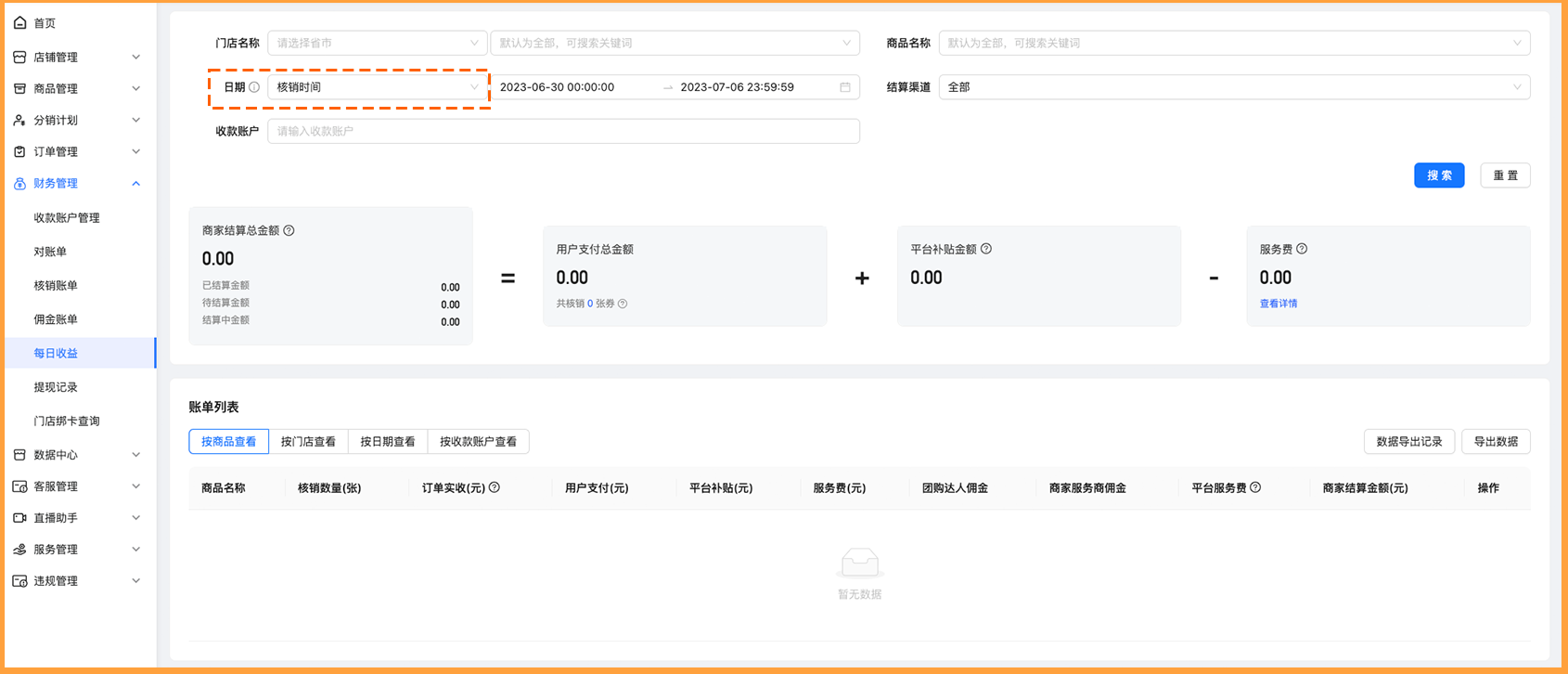 商家可以按照核销日期和结算日期2个类型进行数据的查询和对账。