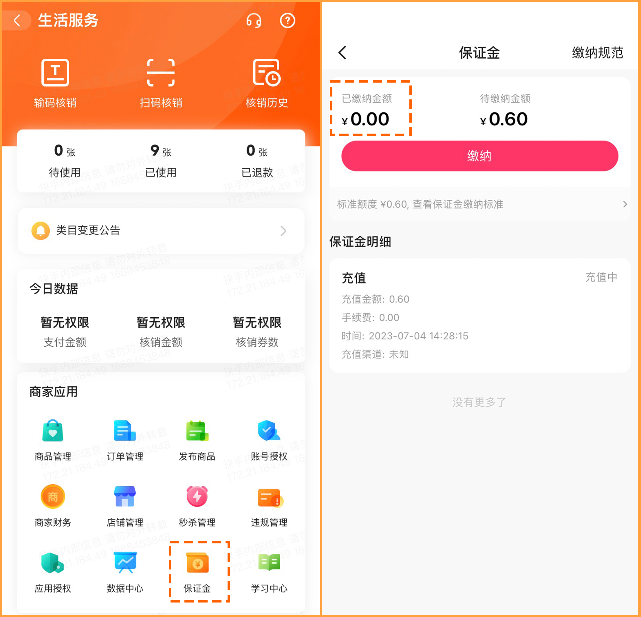 手机端查询方式: 进入App【商家后台】,点击「保证金」,即可在详情页查看已缴金额。 |