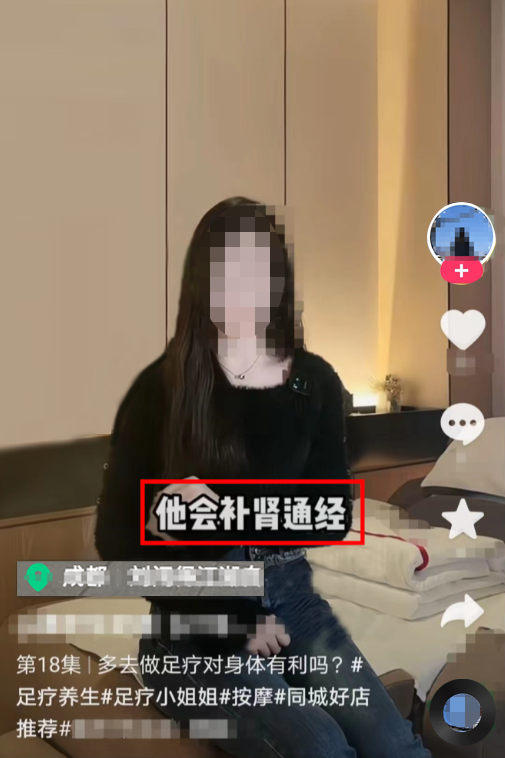 视频中,达人宣传做足疗可以补肾通经,涉嫌夸大虚构按摩的功效。 |