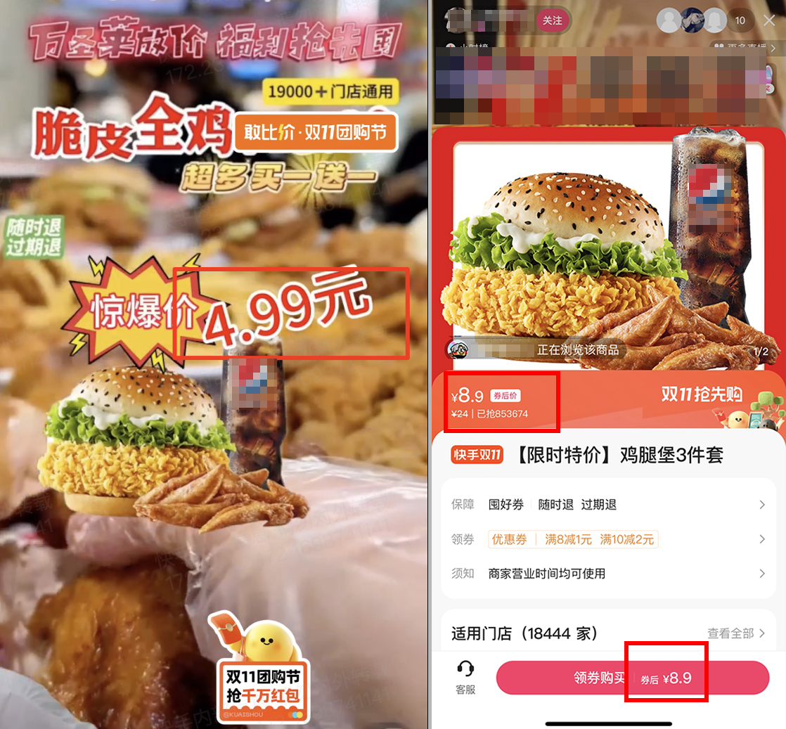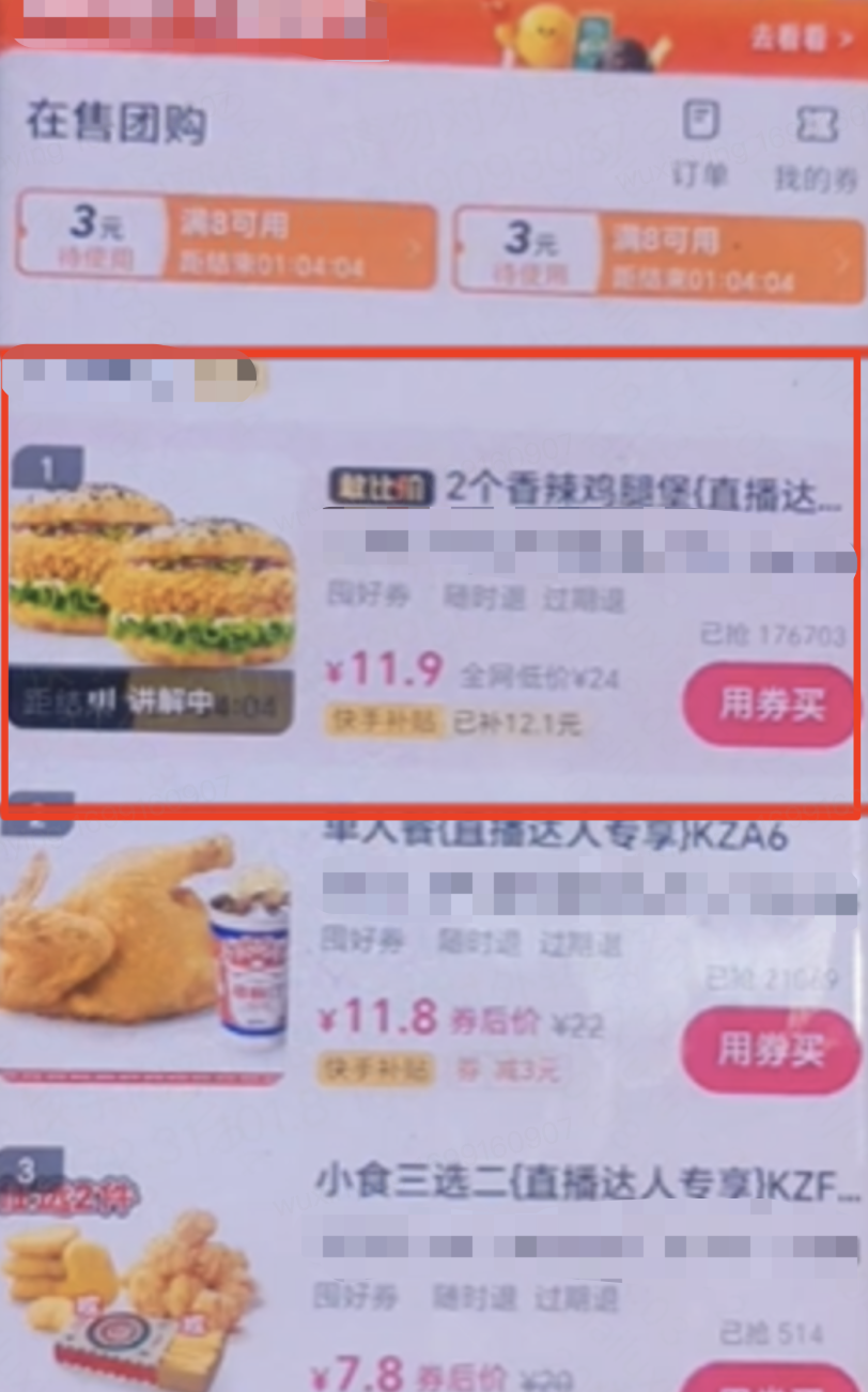 直播间怼屏幕展示团购列表页宣传【2个香辣鸡腿堡】价格为11.9元,该价格是主播视角看到的券后价,实际在用户侧有的用户看到的价格会出现高于"11.9元",因此会被判定为价格不一致 |